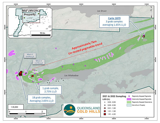 Vancouver, BC, Dec 21, 2022 - (ACN Newswire) - Queensland Gold Hills Corp. (TSXV:OZAU.VN) (OTC-BB:MNNFF) ("Queensland Gold" or the "Company") is pleased to announce results from surface sampling programs completed on the 86 square kilometre Mia Lithium Property (the "Property") in the James Bay area of Quebec, Canada, by Canadian Mining House, the vendors of the Property ("CMH"), prior to its acquisition by the Company.