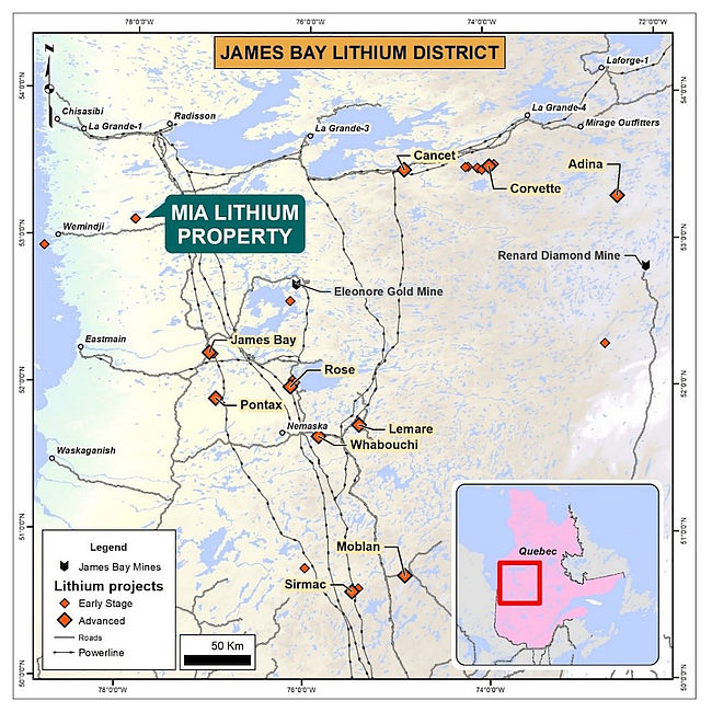 The Property is comprised of 170 mineral claims, located 62 km East of Wemindji Community in the Eeyou Itschee Territory, James Bay, Quebec. The lithium mineral showings are located approximately 10 kilometres from the nearest highway.