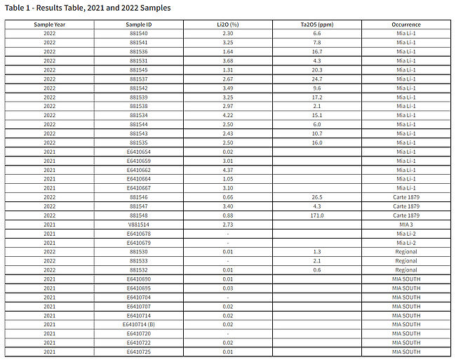 Collectively, the sampling from 18 outcrop grab samples at the Mia Li-1 occurrence (5 in 2021 and 13 in 2022) have an average grade of 2.65% Li2O.