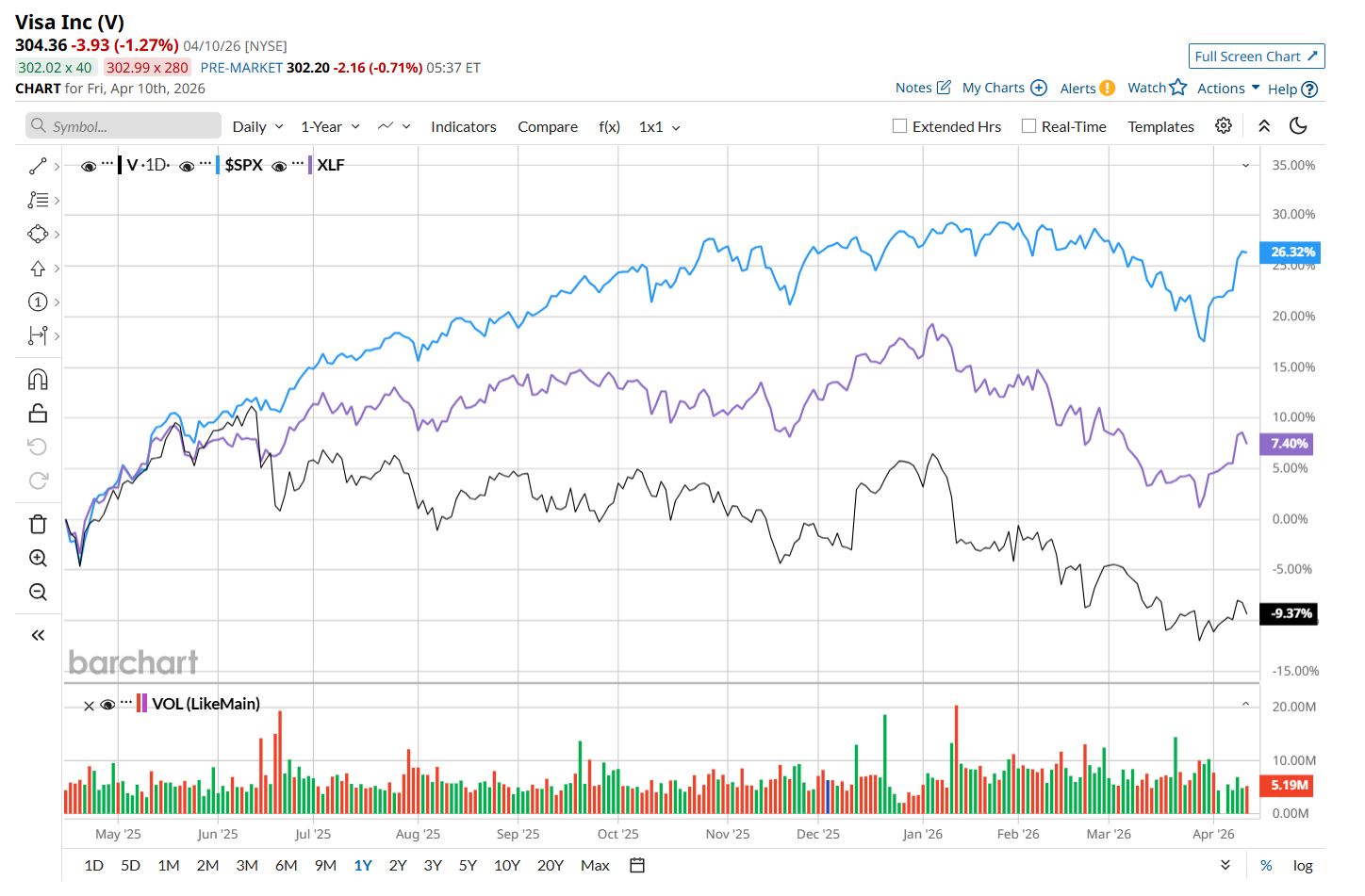 V has declined 6.2% over the past 52 weeks, trailing both the S&P 500 Index's ($SPX) 29.4% return and the State Street Financial Select Sector SPDR ETF’s (XLF) 10.6% uptick over the same time period.