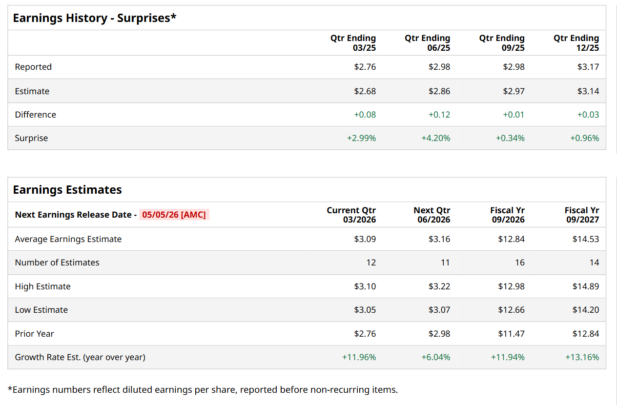 For the current fiscal year, ending in September, analysts expect V to report a profit of $12.84 per share, up 11.9% from $11.47 per share in fiscal 2025. Furthermore, its EPS is expected to grow 13.2% year-over-year to $14.53 in fiscal 2027.
