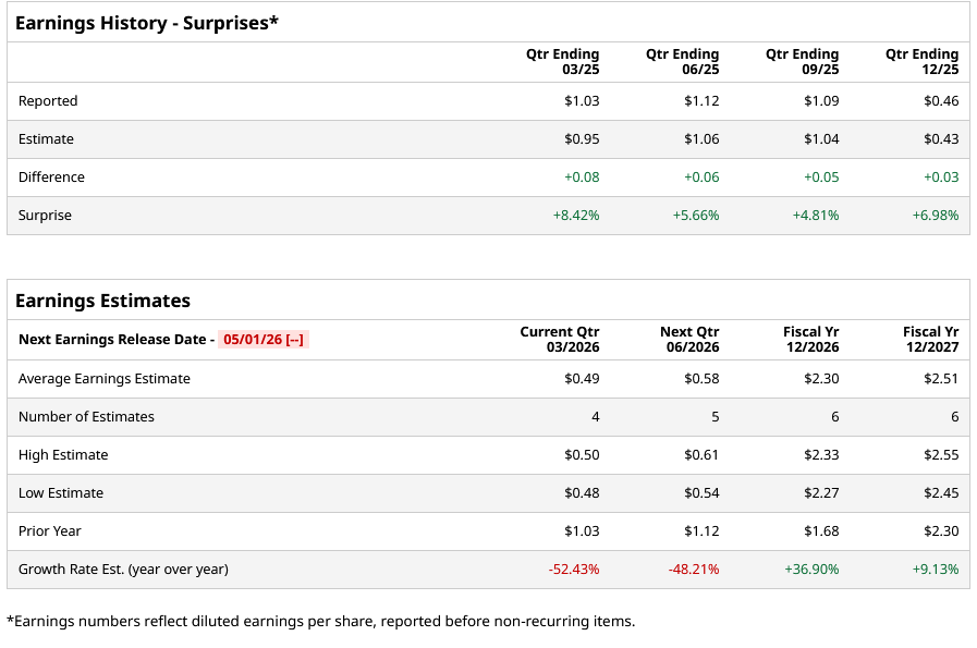 DD is expected to release its Q1 2026 earnings soon. Ahead of the event, analysts expect the company’s EPS to be $0.49 on a diluted basis, down 52.4% from $1.03 in the year-ago quarter. The company has exceeded Wall Street’s EPS estimates in each of its last four quarters.
