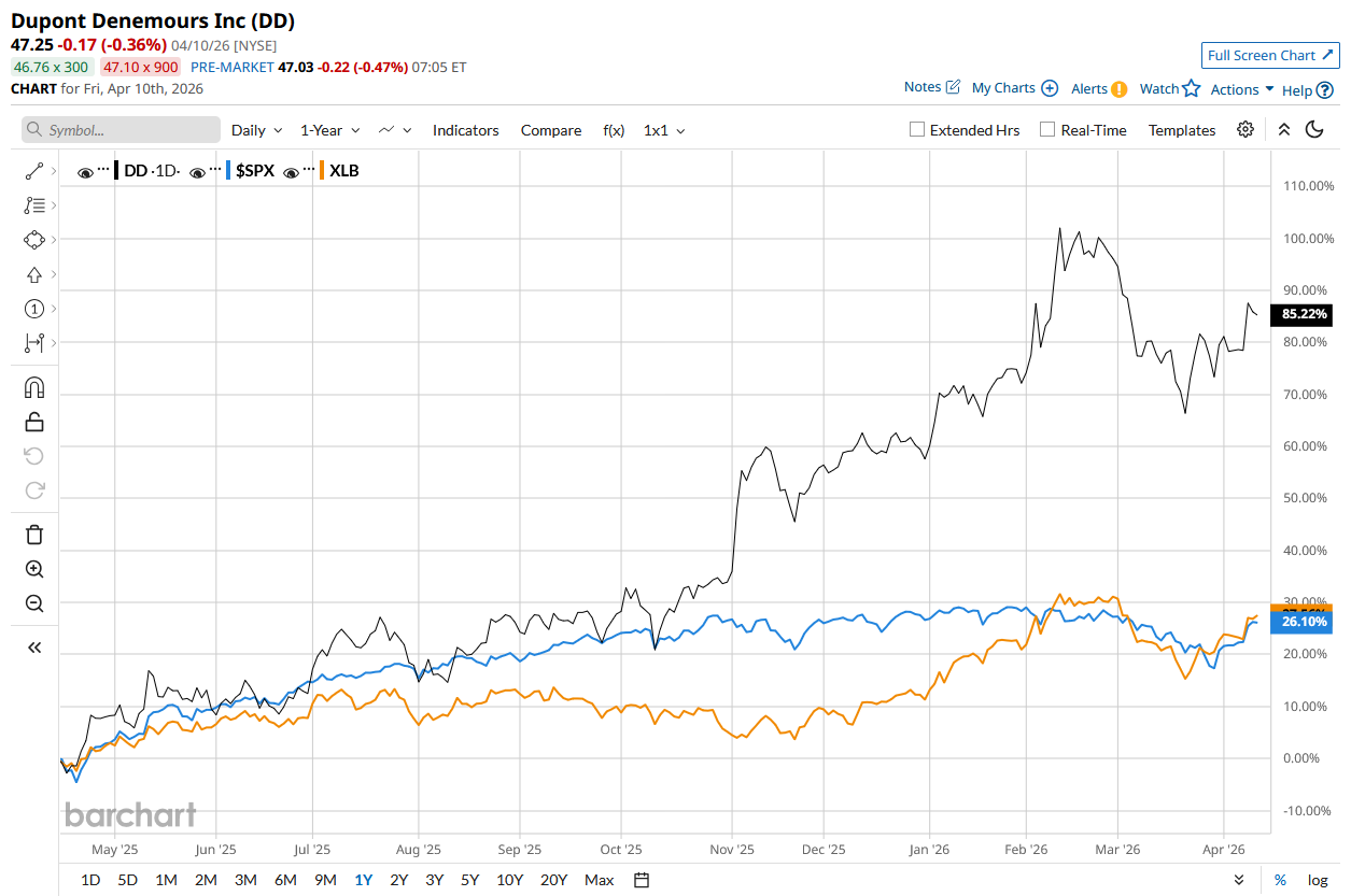 DD stock has surged 95.9% over the past 52 weeks, outperforming the S&P 500 Index’s ($SPX) 29.4% rise and the State Street Basic Materials Select Sector SPDR ETF’s (XLB) 32.9% rise during the same time frame.