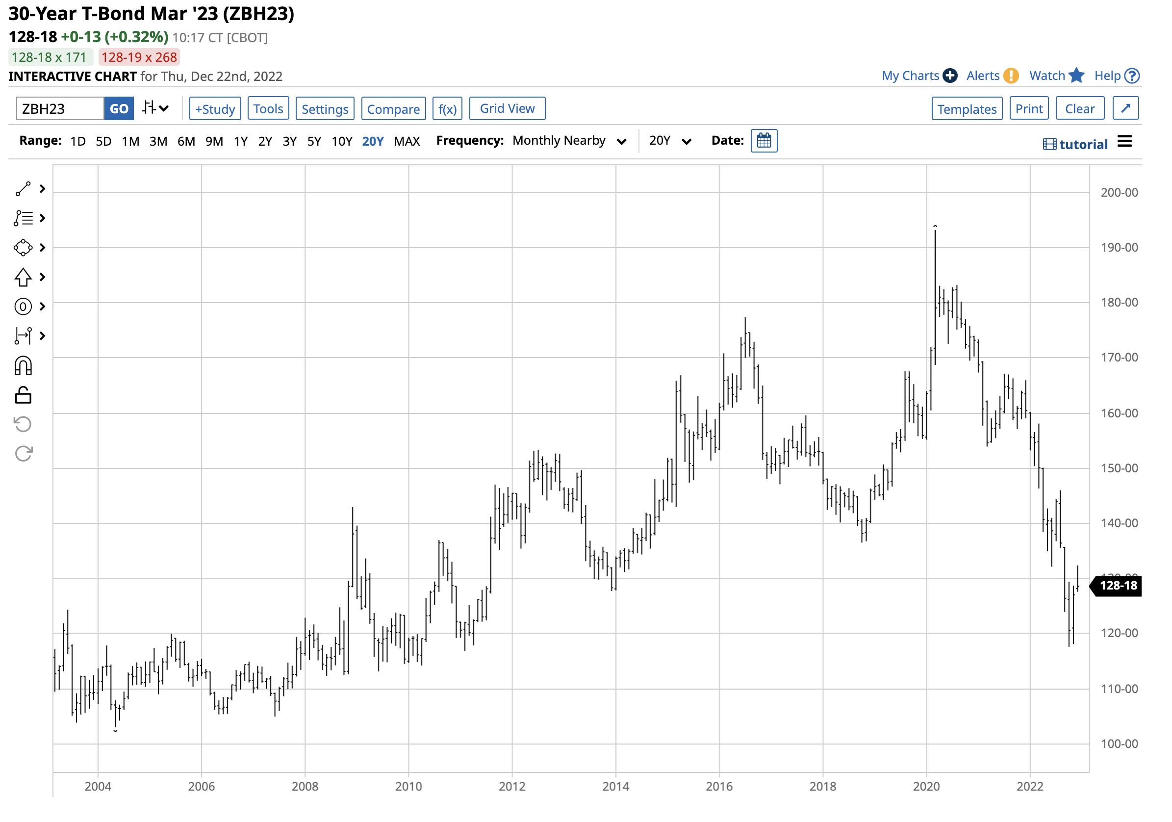 The chart of the U.S. government 30-Year Treasury bond futures shows a steady decline in 2022. The U.S. Federal Reserve increased the short-term Fed Funds Rate from zero percent in March to 4.25% to 4.50% at the final December FOMC meeting. The central bank’s quantitative tightening program to reduce its swollen balance sheet has pushed rates for longer maturities higher.
