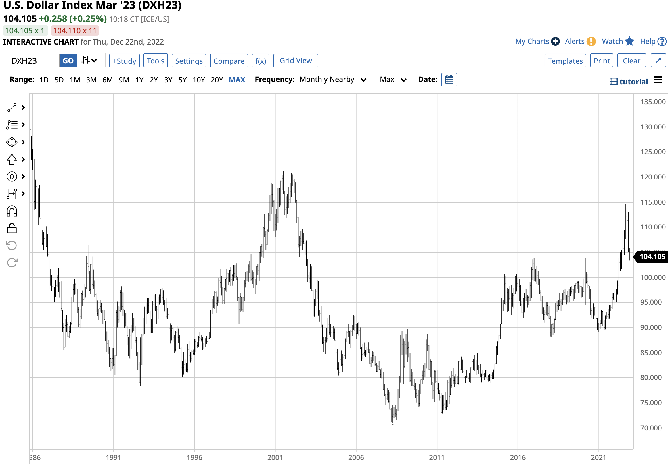 The dollar index futures chart shows the U.S. currency’s explosive rally in 2022, which took the index to 114.785, the highest level since 2002.