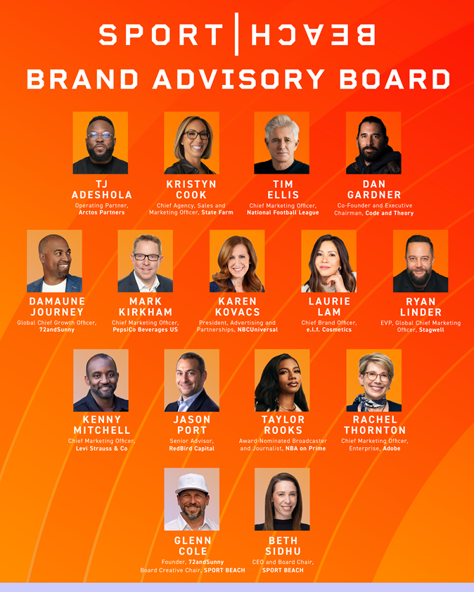 Spanning sport, tech, beauty, finance, retail, and CPG, the Board brings a breadth of experience that reflects the SPORT BEACH community itself. Their input will inform the platform's year-round strategy, from talent and programming to partnerships and global distribution. The Board will be chaired by SPORT BEACH CEO Beth Sidhu, with 72andSunny Founder and Chairman Glenn Cole serving as Board Creative Chair.