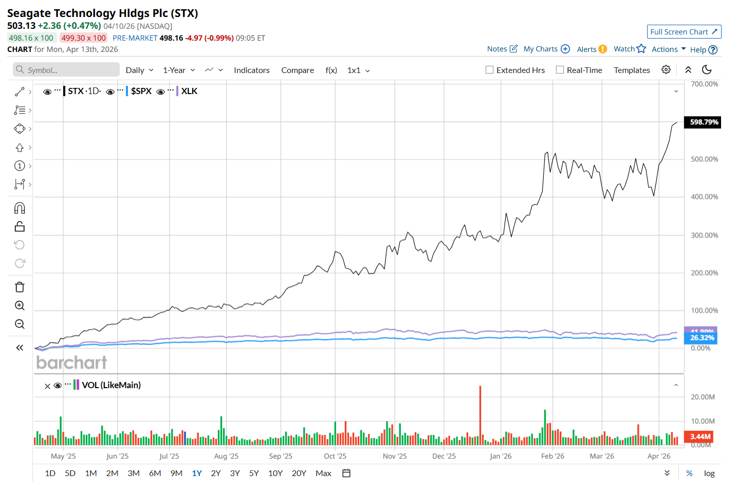 STX has skyrocketed 609.2% over the past 52 weeks, significantly outpacing both the S&P 500 Index's ($SPX) 29.4% return and the State Street Technology Select Sector SPDR ETF’s (XLK) 42.9% uptick over the same time period.