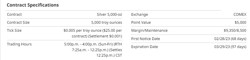 Futures traders can trade the standard-size contract (SI). Beware, this contract is for 5,000 ounces of silver and can be very volatile and costly to trade. The CMEGroup does offer a micro silver contract (Barchart symbol SO, CME symbol SIL). The contract size is 1,000 ounces, and the capital requirements are 1/5 of the standard-size contract.Â