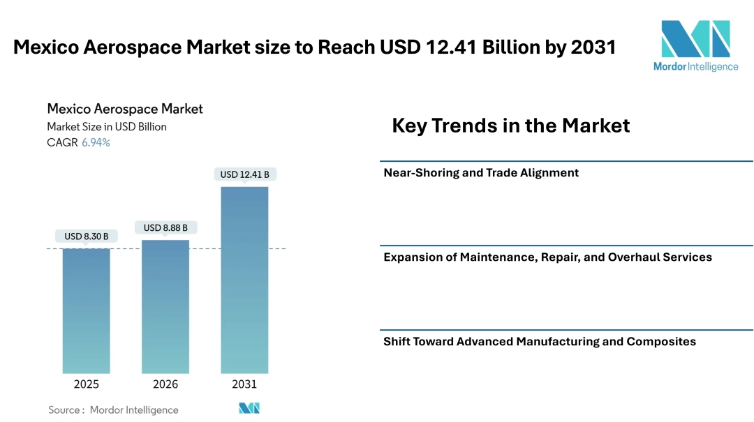 According to Mordor Intelligence, the Mexico aerospace market size is projected to grow from USD 8.3 billion in 2025 to USD 8.88 billion in 2026, and further reach USD 12.41 billion by 2031, registering a CAGR of 6.94% during the forecast period. The Mexico aerospace industry has positioned itself as a key production and supply hub in North America, supported by trade agreements and proximity to major aerospace markets.