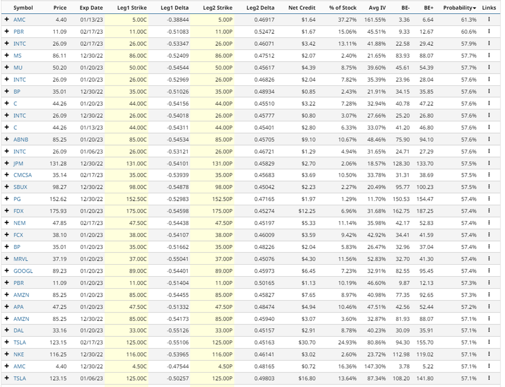The screener shows some interesting short straddle trades on popular stocks such as AMC, PBR, INTC, MS, MU, BP, C, ABNB, JPM, SBUX, PG, FDX, NEM, AMZN and TSLA.