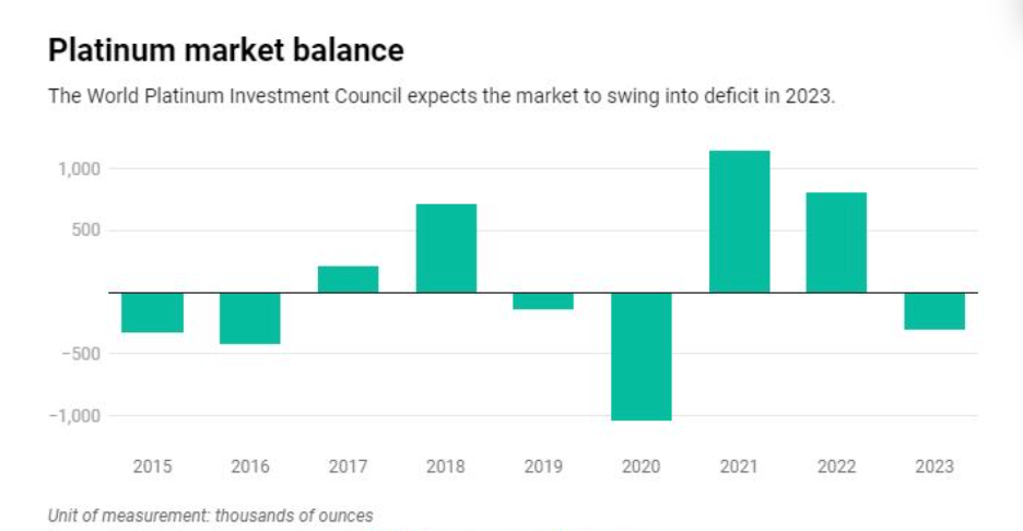 Conversely, during rallies, offers to sell can disappear, causing upside price explosions. On late November 2022, the World Platinum Investment Council said that after a significant platinum surplus in 2022, it forecasts the metal will move into a deficit in 2023. The Council expects automaker requirements to rise and investors reverse from net sellers to net buyers, pushing demand up 19% to 7.77 million ounces, the highest level since 2020.