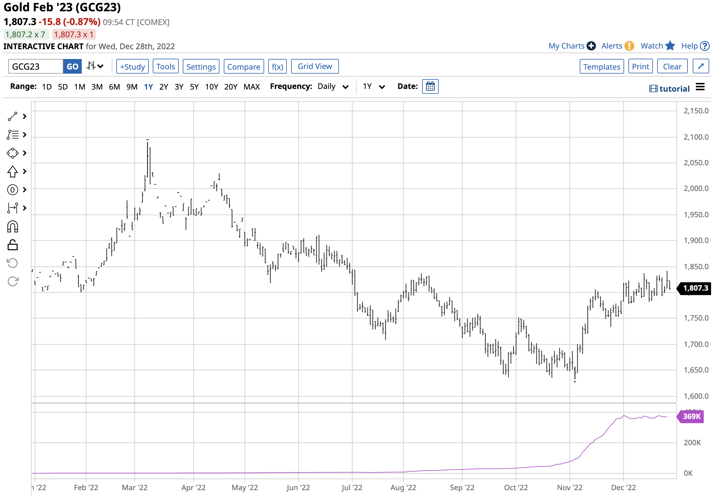 The chart of the nearby COMEX gold futures chart for February delivery shows open interest at 369,000 contracts. Each contract calls for 100 ounces, so open interest reflects 36.9 million ounces of gold, valued at $66.69 billion at $1,807.30 per ounce.