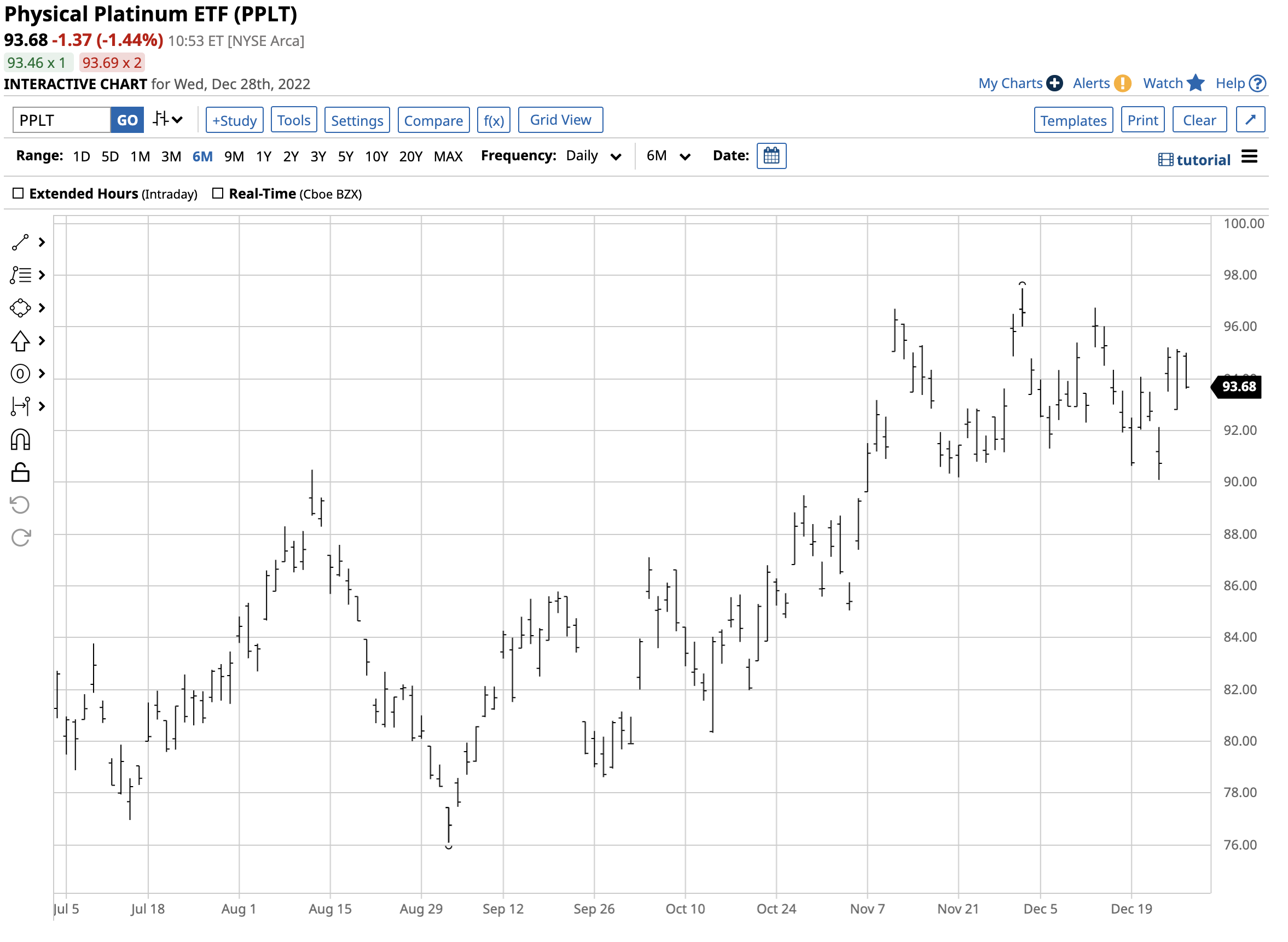 Over the same period, PPLT rallied from $76.09 to $97.50 per share, or 28.1%. Platinum trades around the clock during the business week, while PPLT is only available for trading when the stock market is operating. Therefore, the ETF can miss highs or lows outside the U.S. stock market hours.