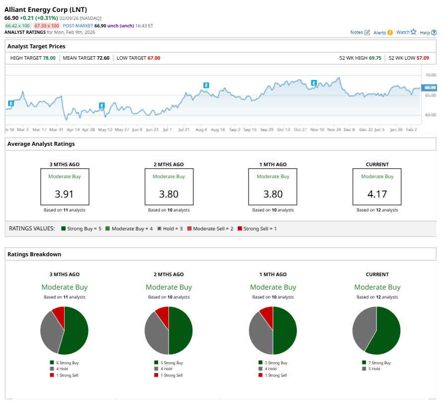 Among the 12 analysts covering LNT stock, the consensus is a “Moderate Buy.” That’s based on seven “Strong Buy” ratings, and five “Holds.”
