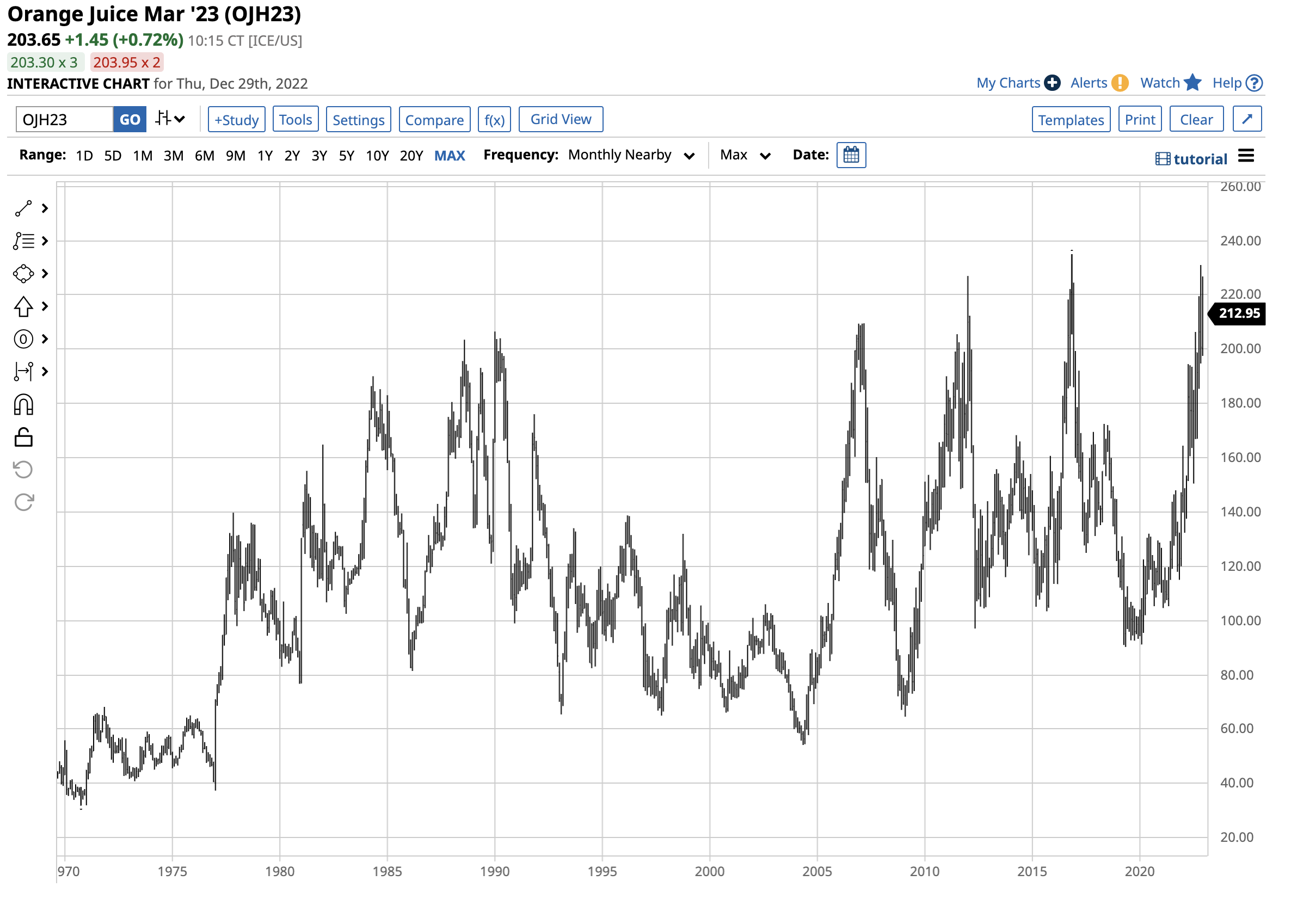 Frozen concentrated orange juice futures hit a $2.31 per pound high in November 2022, the highest price since November 2016 when FCOJ traded to its record $2.35 high.