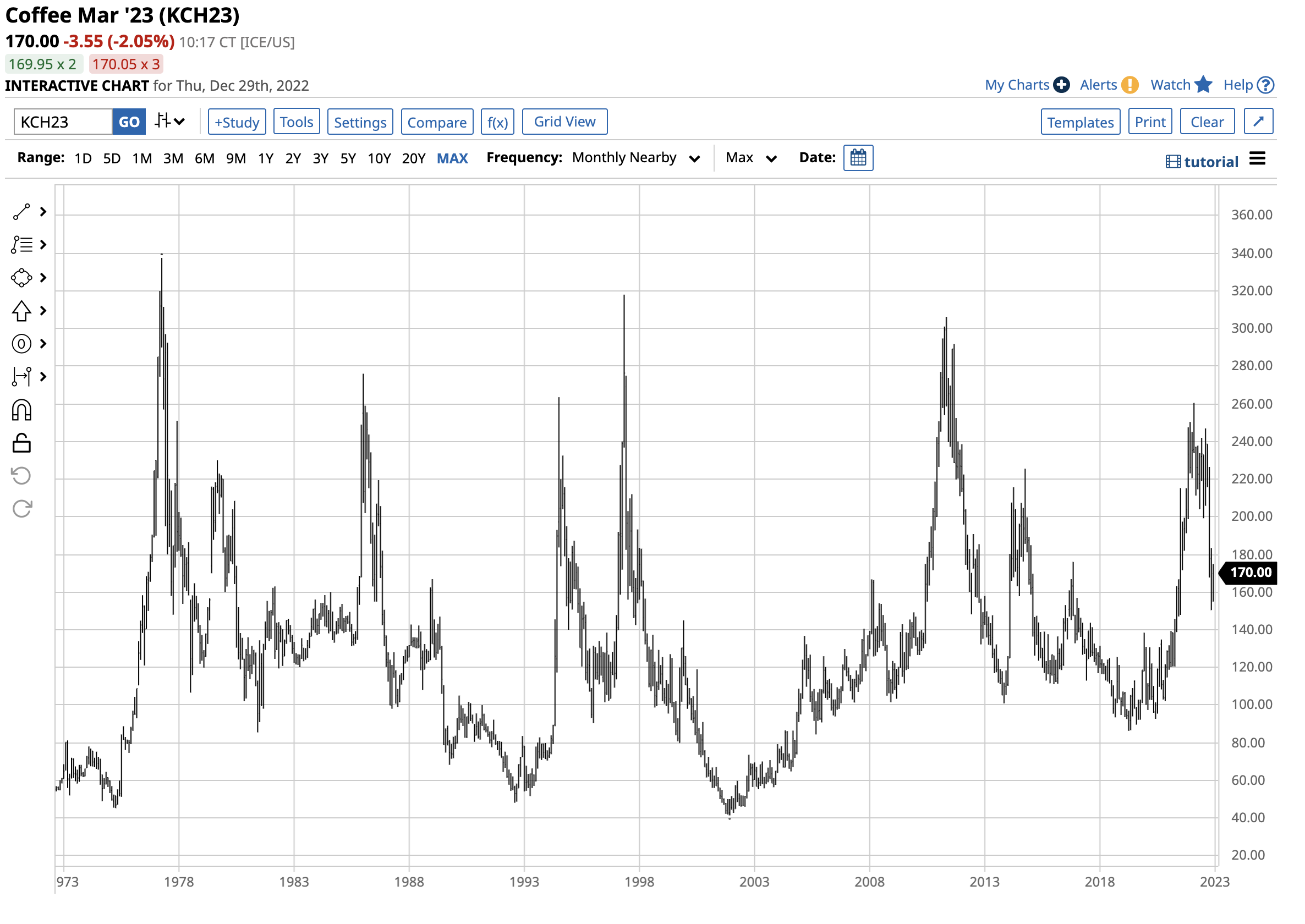 Nearby Arabica coffee futures rose to $2.6045 per pound in February 2022, the highest price since 2011, when coffee futures last traded above the $3 per pound level.