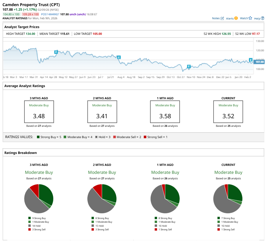 On Feb. 6, Colliers Securities analyst Barry Oxford maintained a “Buy” rating on CPT and set a price target of $125, implying a potential upside of 15.9% from current levels.