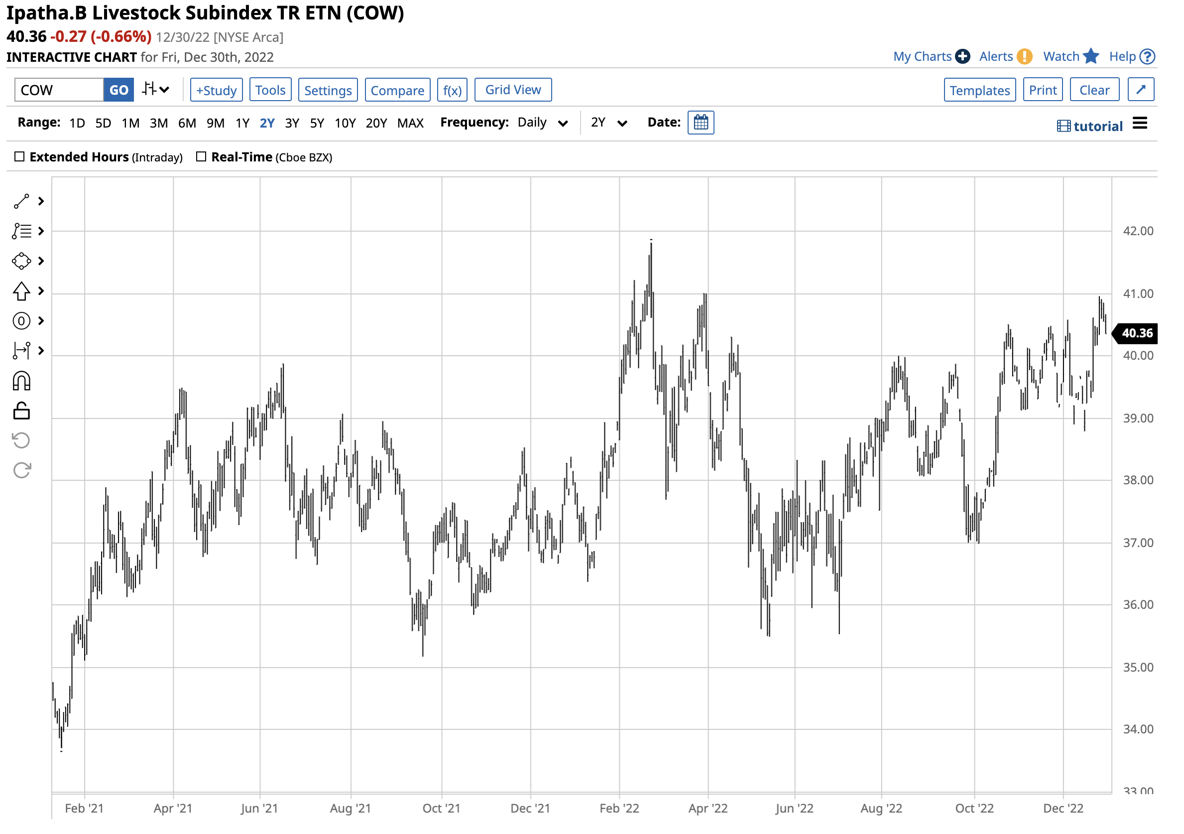 The iPath Series B Bloomberg Livestock Subindex Total Return ETF product (COW) increased with cattle and hog prices in 2022.Â