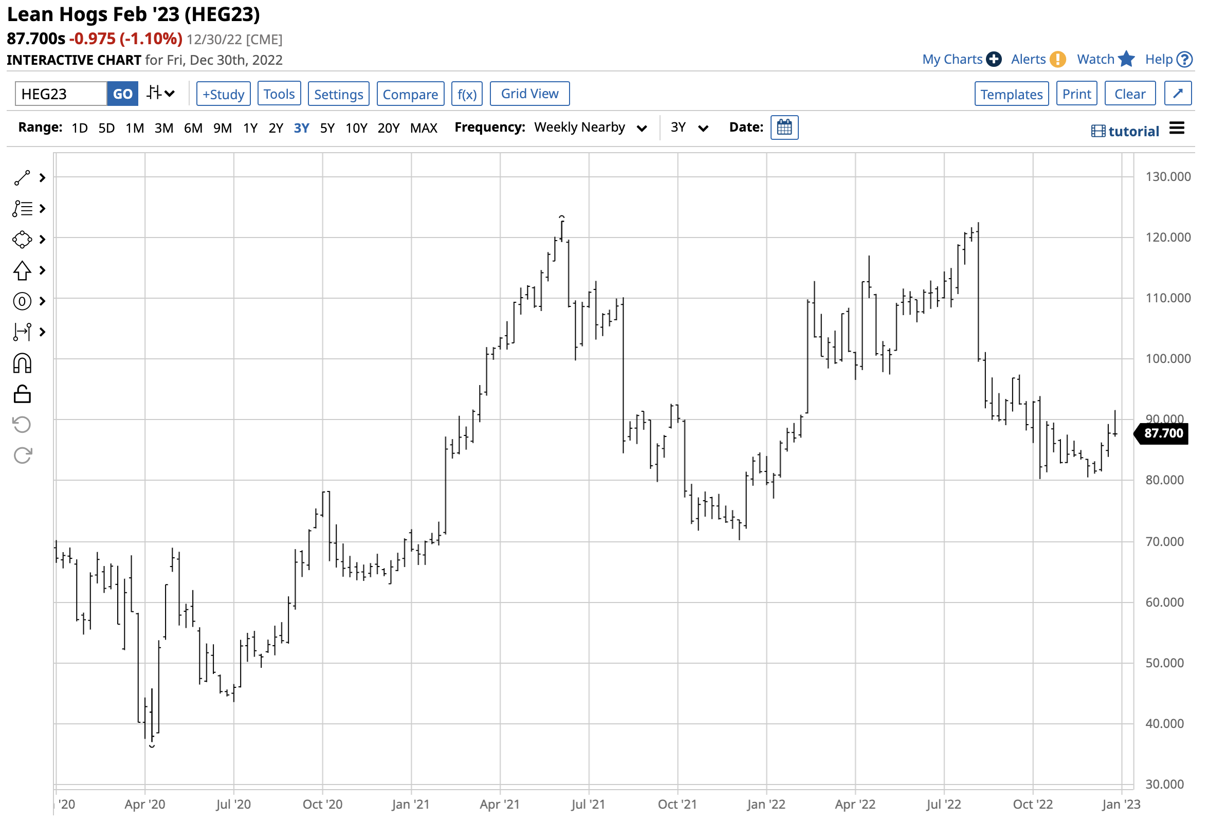 Lean hog futures posted a 1.71% loss in Q4 but were 7.64% higher in 2022. In 2021, lean hog futures rose 15.94%. Nearby February futures settled at 87.70 cents per pound on December 30.