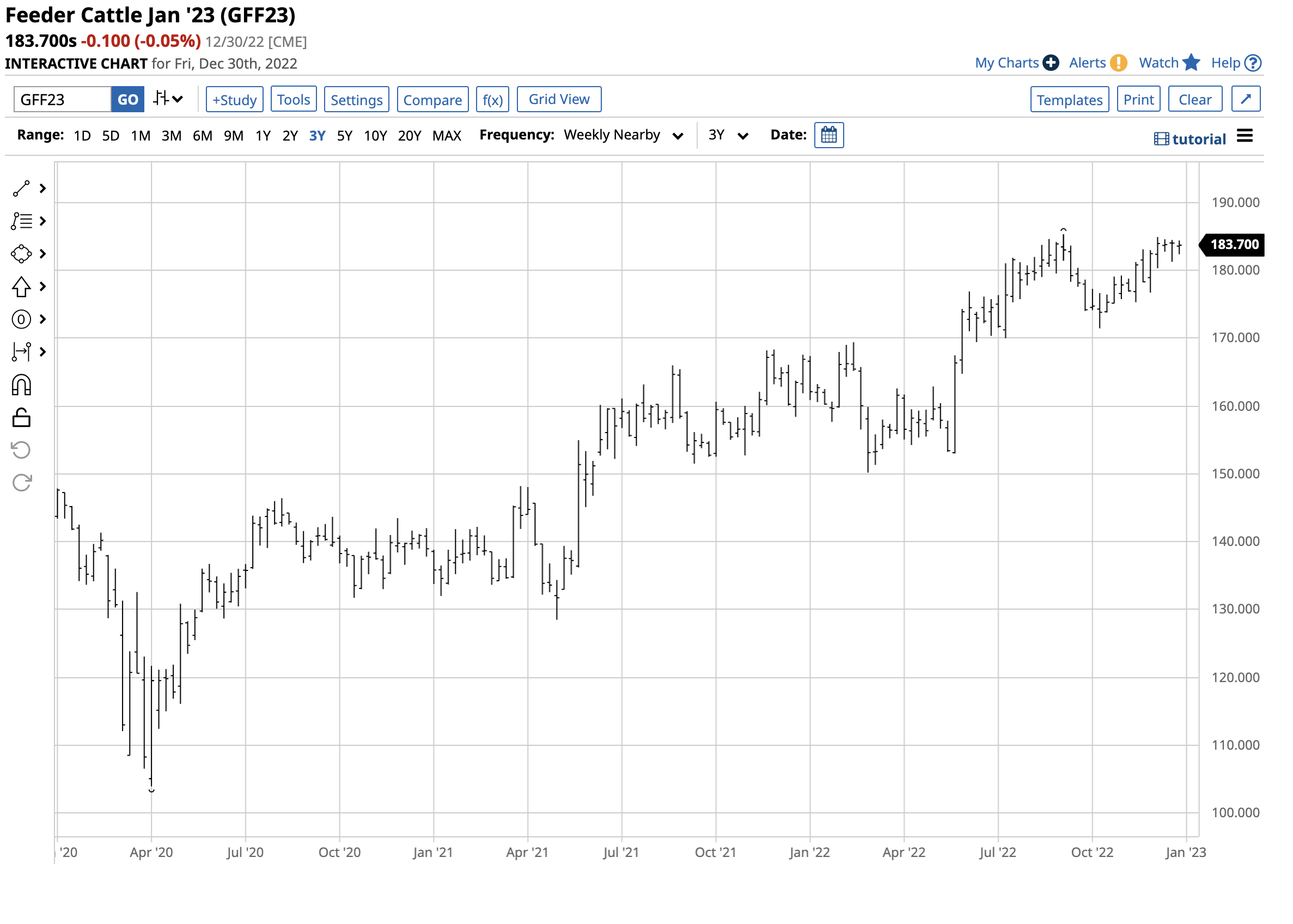 Feeder cattle futures posted a 5.47% gain in Q4 and were 10.08% higher in 2022. In 2021, the feeder cattle futures rose 20.10%. Nearby January futures settled at $1.8370 per pound on December 30.