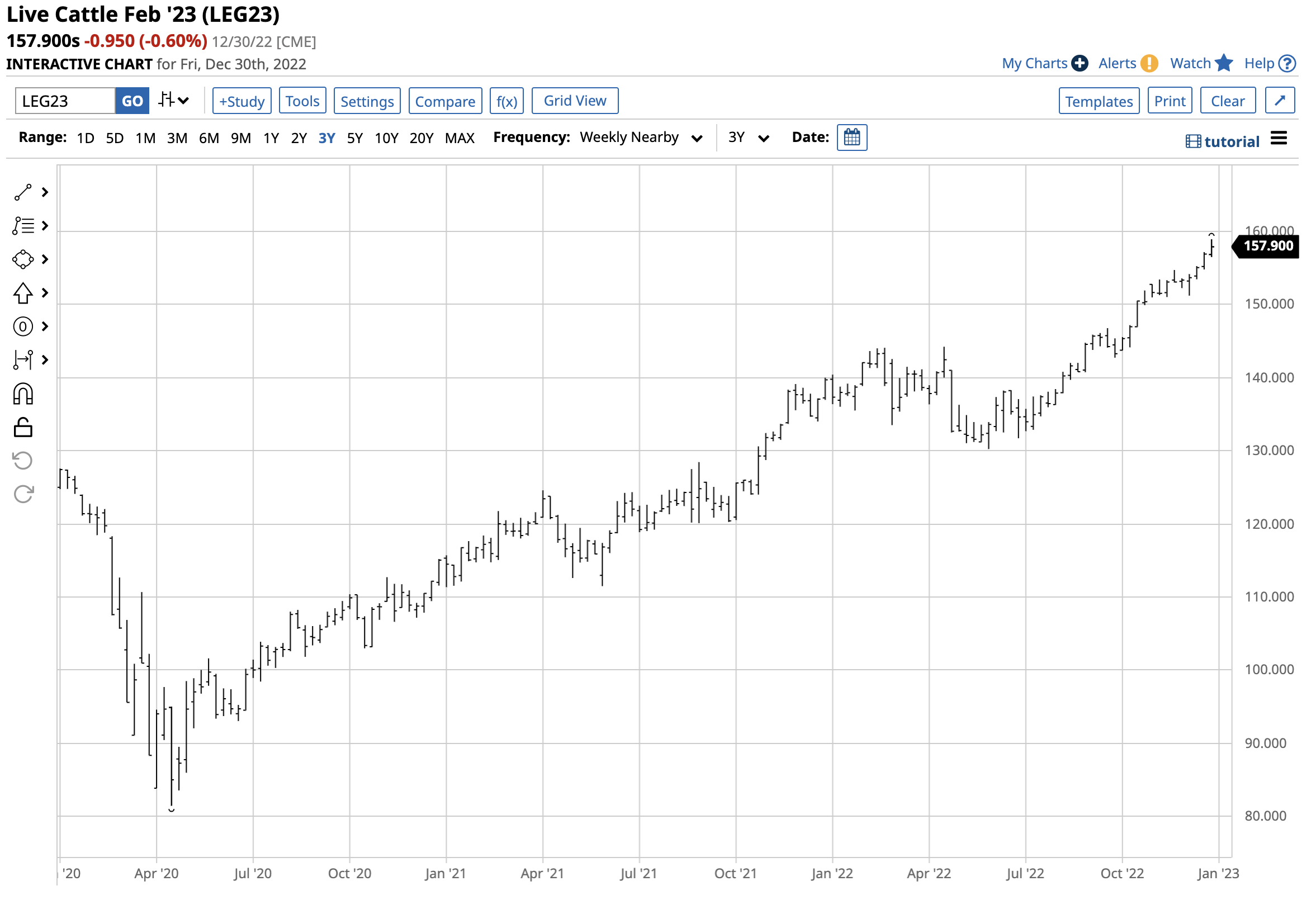 Live cattle futures posted a 10.21% gain in Q4 and were 13.03% higher in 2022. In 2021, the live cattle futures rose 21.45%. Nearby February futures settled at $1.5790 per pound on December 30.