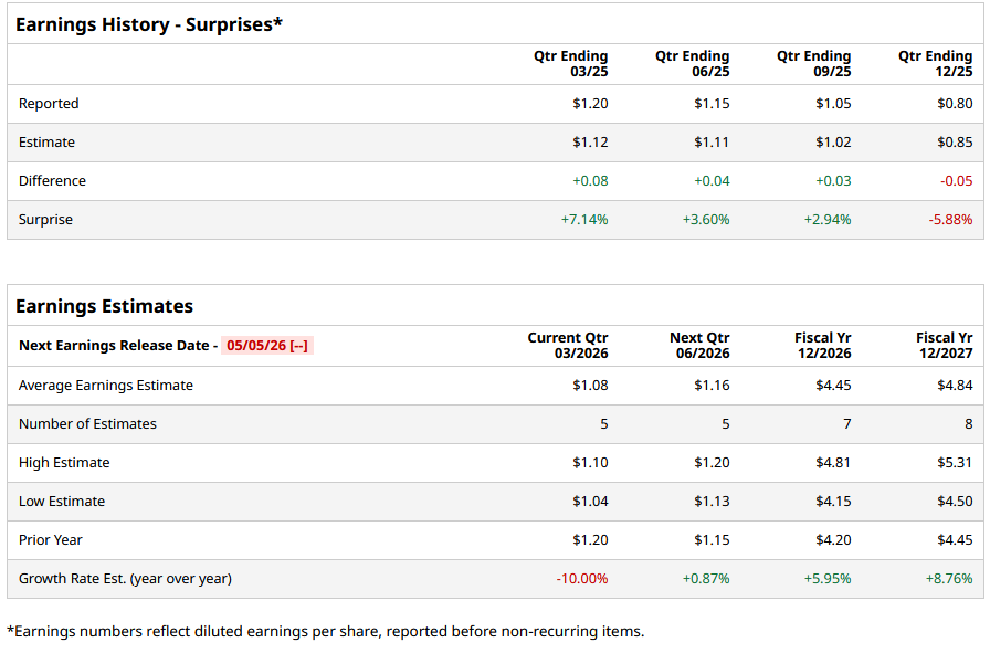 IFF is expected to release its Q1 2026 earnings soon. Ahead of the event, analysts expect the company’s EPS to be $1.08 on a diluted basis, down 10% from $1.20 in the year-ago quarter. The company has exceeded Wall Street’s EPS estimates in three of its last four quarters, while missing on one occasion.