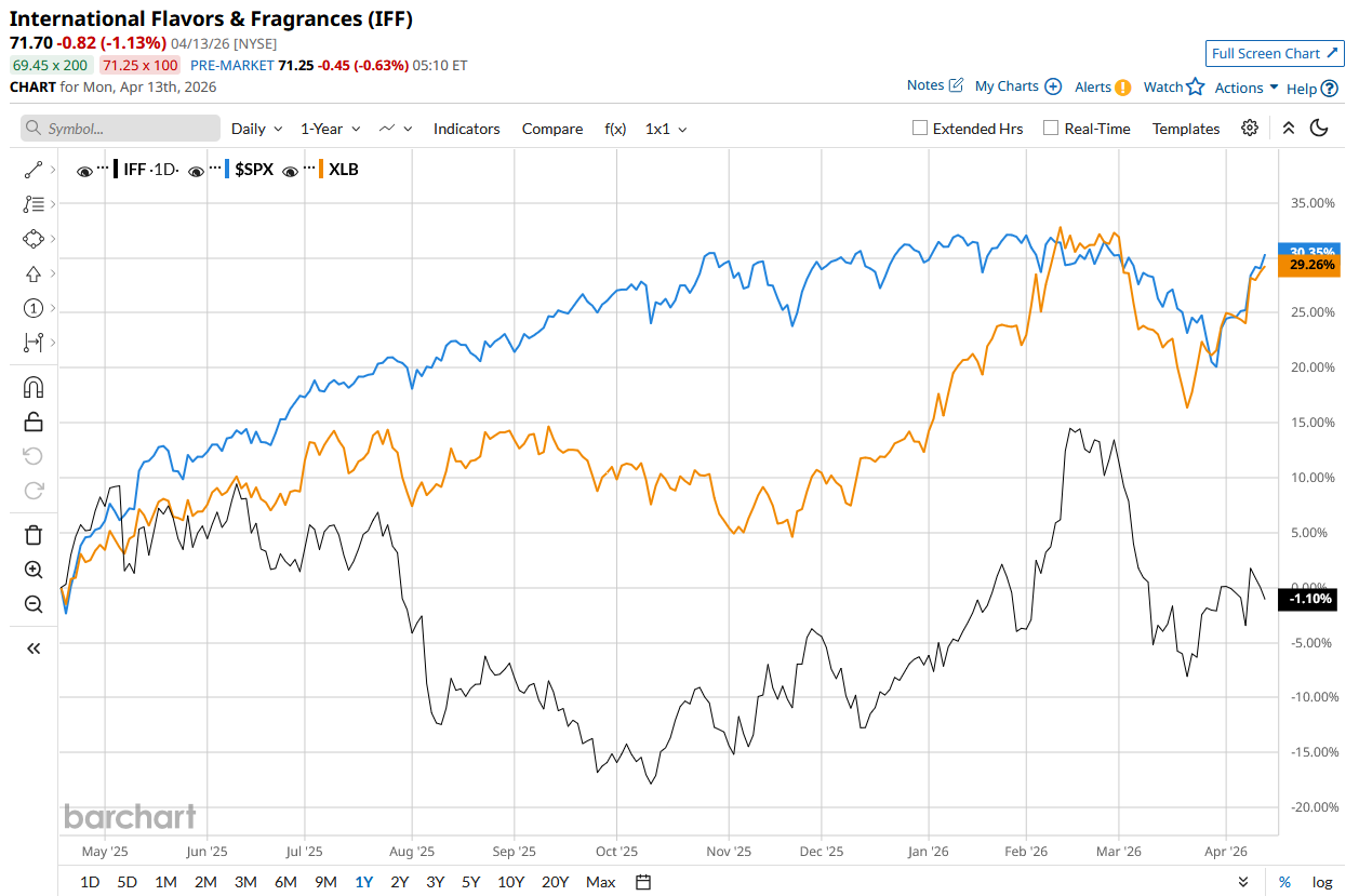 IFF stock has declined 2% over the past 52 weeks, underperforming the S&P 500 Index’s ($SPX) 28.4% rise and the State Street Basic Materials Select Sector SPDR ETF’s (XLB) 30% rise during the same time frame.