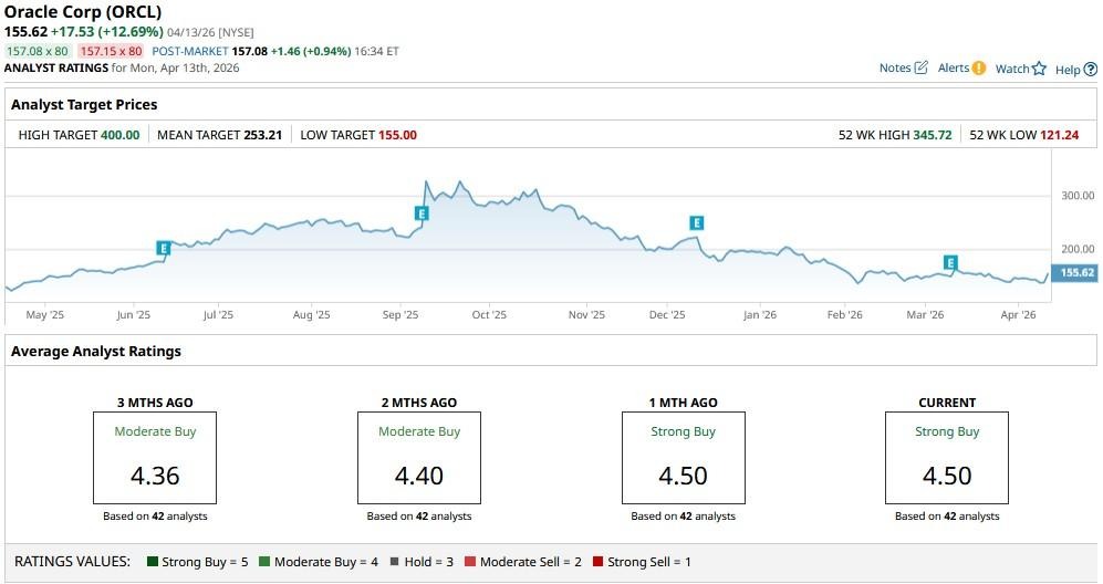 According to Barchart, the consensus rating on Oracle is a “Strong Buy," with the mean price target of about $253 indicating potential upside of a whopping 65% over the next 12 months.Â