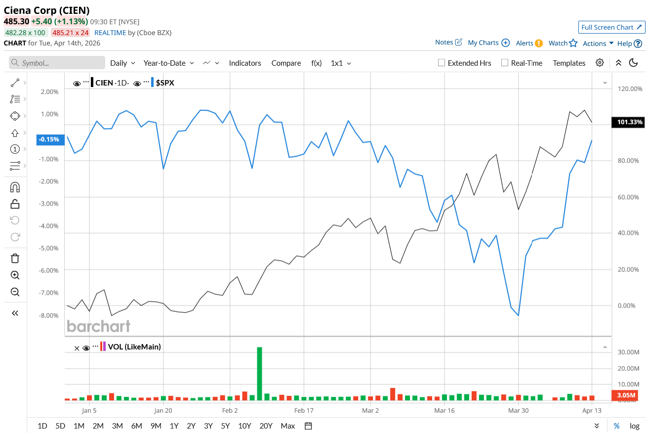 This year, the spotlight fell on CIEN stock after it reported a blowout start to fiscal 2026. The company reported revenue of $1.43 billion, marking a 33% year-over-year (YoY) increase. Earnings per share (EPS) doubled from the year-ago quarter to $1.35. However, this was not a one-off surge. During the Q1 earnings call, management stated that demand remains “incredibly strong,” backed by exceptional order activity and long-term customer commitments. This led to a $2 billion backlog in a single quarter, bringing the total backlog to $7 billion, indicating continued revenue growth through 2027.