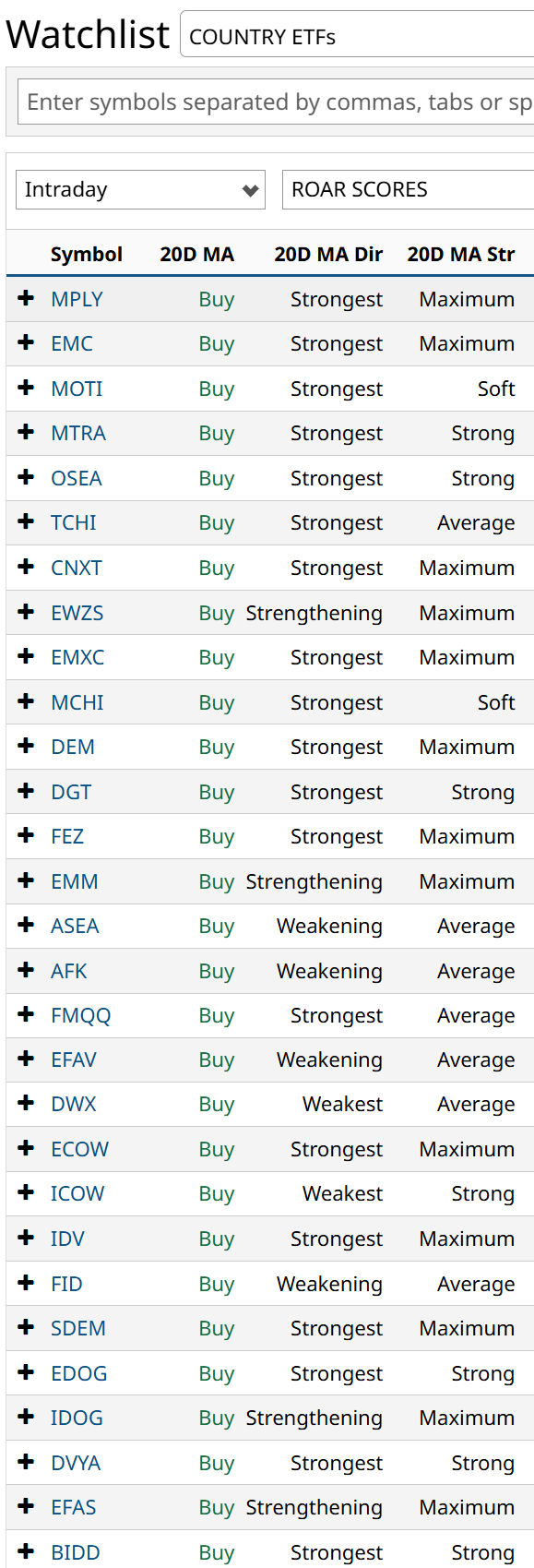 Of course you don’t! Because they are all moving in sync! What you don’t see: there are a total of 93 ETFs in this watchlist of mine. 92 of them are currently rated “Buy” by Barchart Opinion (as of Monday’s close). Sure, they vary in degree. But not in the bottom-line conclusion.