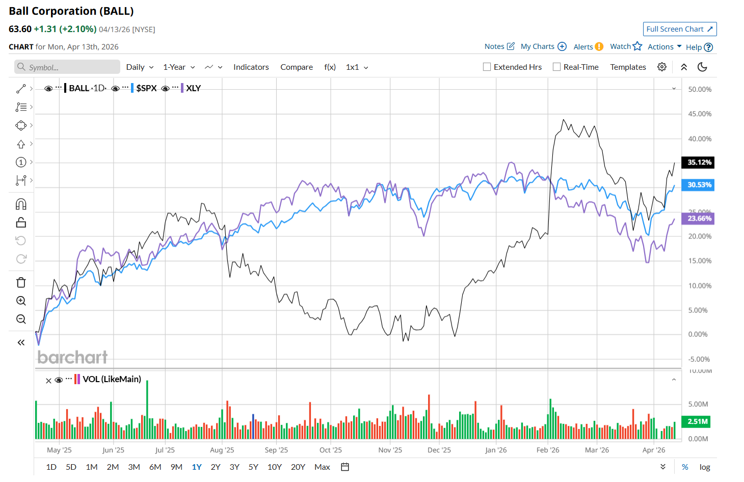BALL has rallied 32.3% over the past 52 weeks, outpacing both the S&P 500 Index's ($SPX) 28.4% return and the State Street Consumer Discretionary Select Sector SPDR ETF’s (XLY) 20.5% uptick over the same time period.