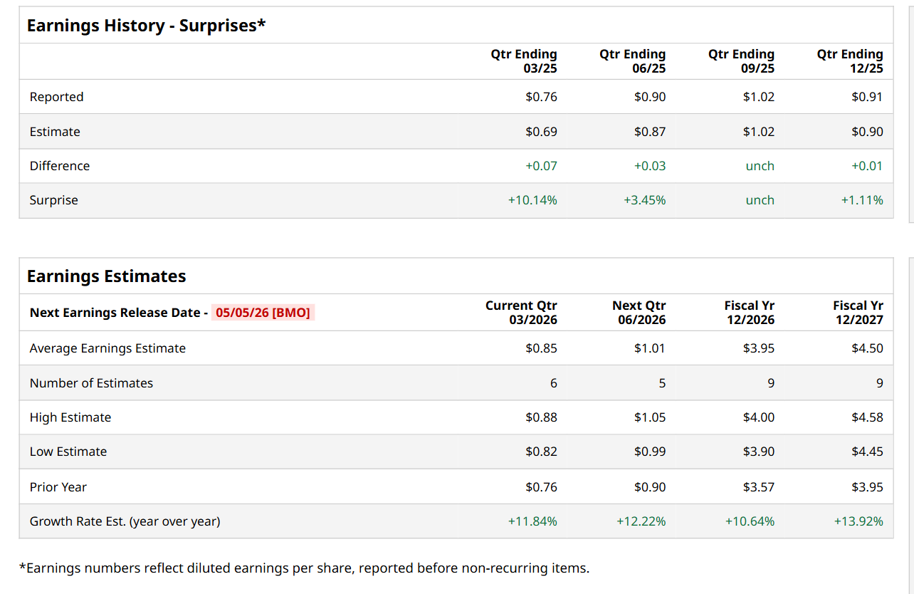 Ahead of this event, analysts expect this packaging company to report a profit of $0.85 per share, up 11.8% from $0.76 per share in the year-ago quarter. The company has met or topped Wall Street’s bottom-line estimates in each of the last four quarters. In Q4 2025, BALL’s EPS of $0.91 outpaced the consensus expectations by a penny.