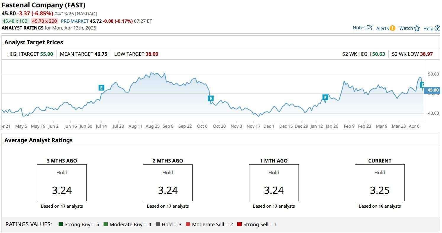The consensus rating on FAST stock sits at “Hold” only, with the mean price target of nearly $47 no longer indicating meaningful upside potential from current levels.