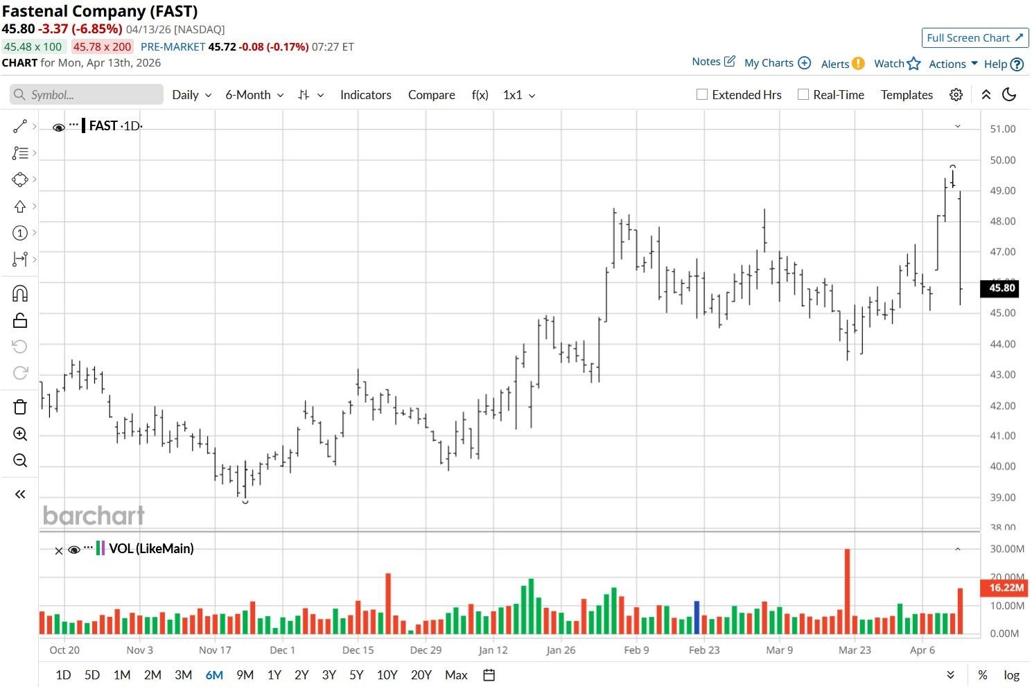 Despite the recent pullback, however, Fastenal shares remain up more than 12% versus the start of this year.