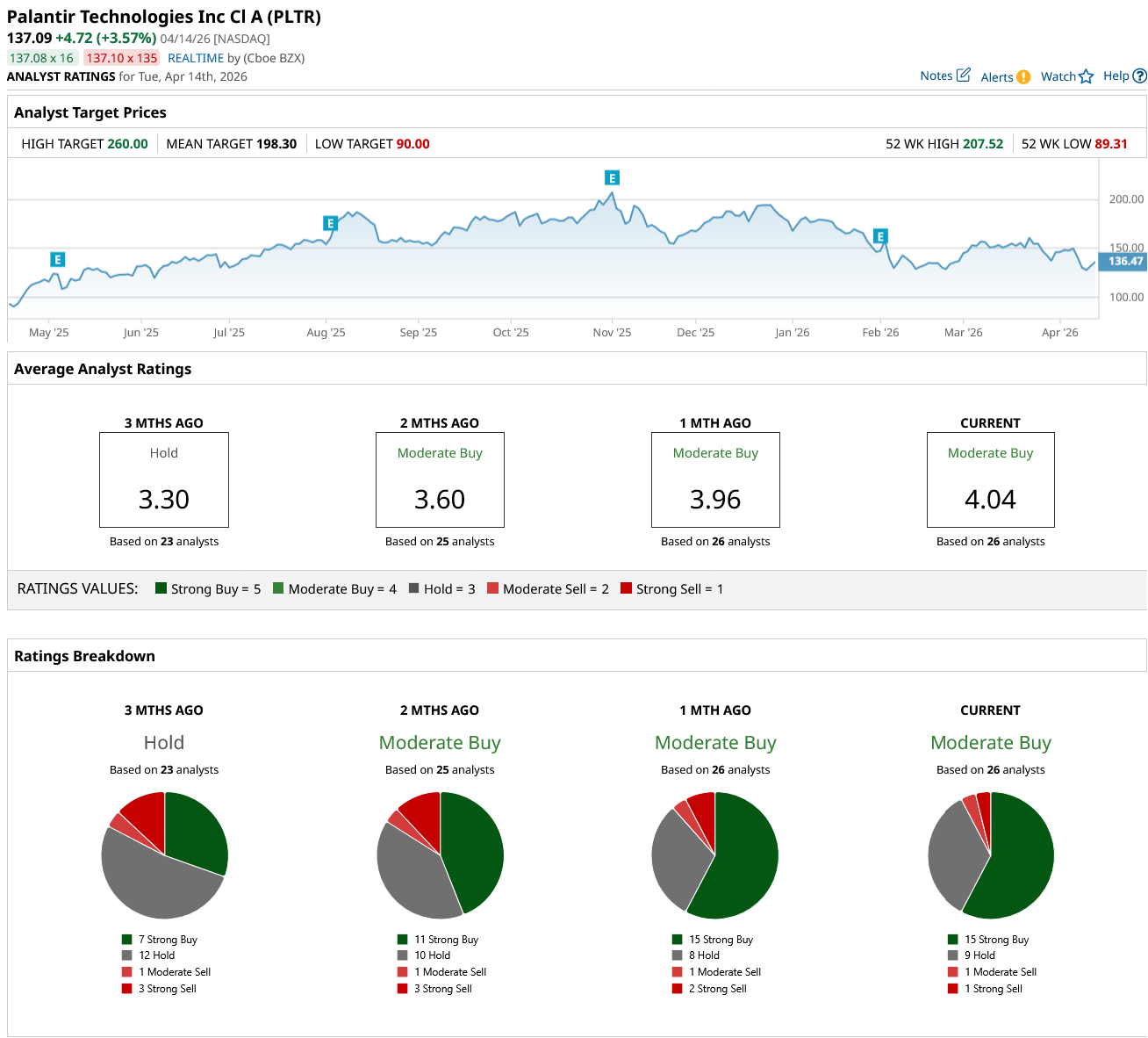 Out of the 26 analysts covering PLTR stock, 15 recommend “Strong Buy,” nine recommend “Hold,” one recommends “Moderate Sell,” and one recommends “Strong Sell.” The average PLTR stock price target is $198.30, above the current price of about $137.