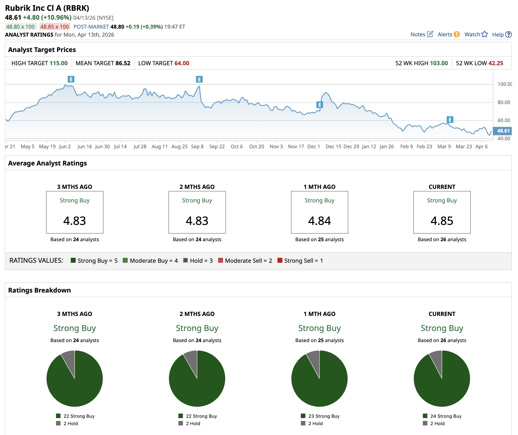 Out of the 26 analysts covering RBRK stock, 24 recommend “Strong Buy,” and two recommend “Hold.” The average RBRK stock price target is $86.52, indicating almost 80% upside from current levels.