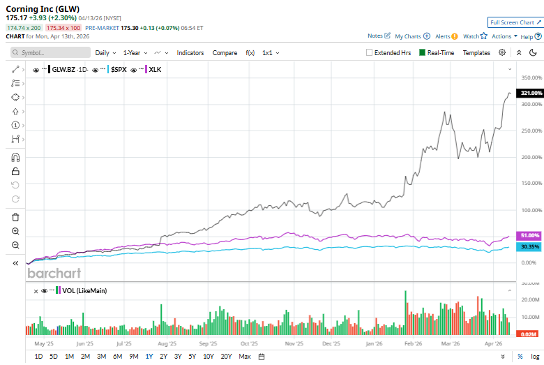 Shares of Corning have soared a whopping 324.6% over the past 52 weeks, significantly outpacing the broader S&P 500 Index's ($SPX) 28.4% gain and the State Street Technology Select Sector SPDR ETF's (XLK) 46.8% return over the same period.