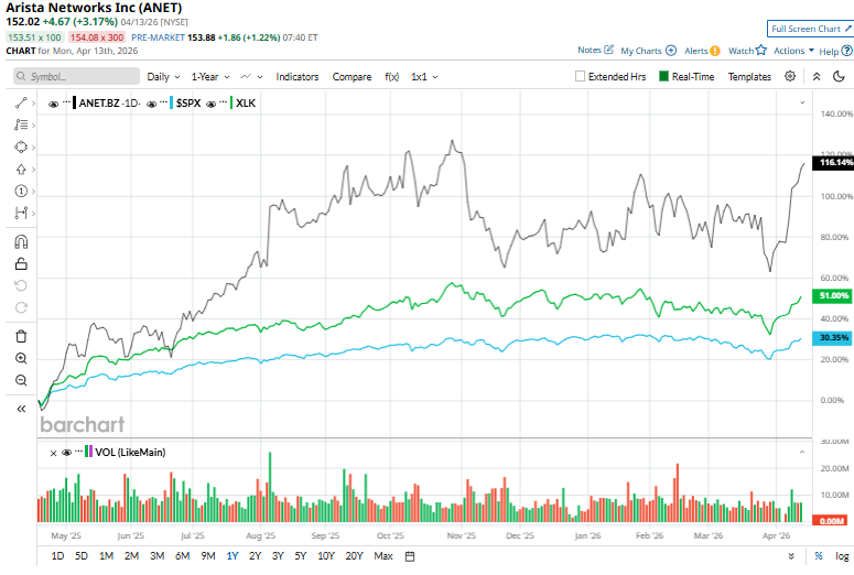 ANET stock has gained 109.2% over the past year, outpacing the S&P 500 Index’s ($SPX) 28.4% gains and the State Street Technology Select Sector SPDR Fund’s (XLK) 46.8% rise over the same time frame.