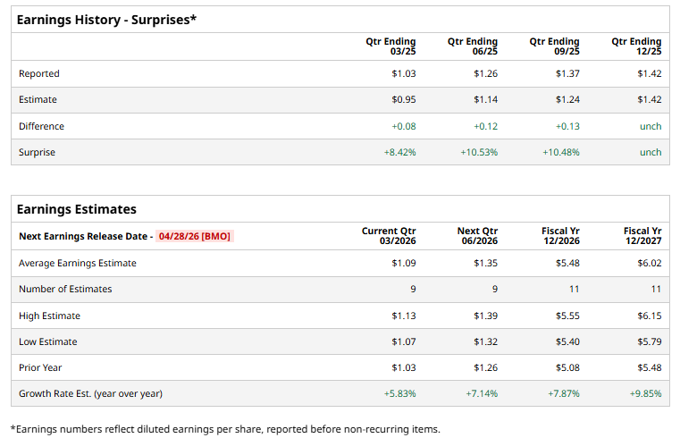 The company is scheduled to announce its fiscal Q1 earnings for 2026 before the market opens on Tuesday, Apr. 28. Ahead of this event, analysts expect this water technology provider to report a profit of $1.09 per share, up 5.8% from $1.03 per share in the year-ago quarter. The company has met or surpassed Wall Street’s bottom-line estimates in each of the last four quarters.