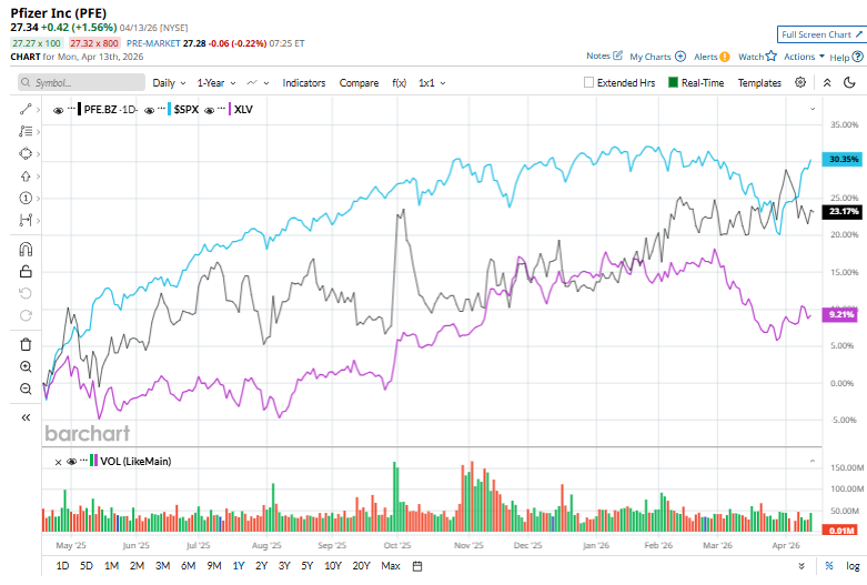 PFE stock has surged 24.8% over the past year, underperforming the S&P 500 Index’s ($SPX) 28.4% gains. However, it surpassed the State Street Health Care Select Sector SPDR Fund’s (XLV) 8.1% returns over the same time frame.