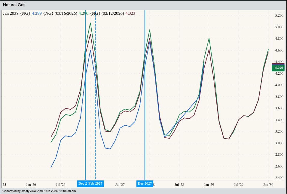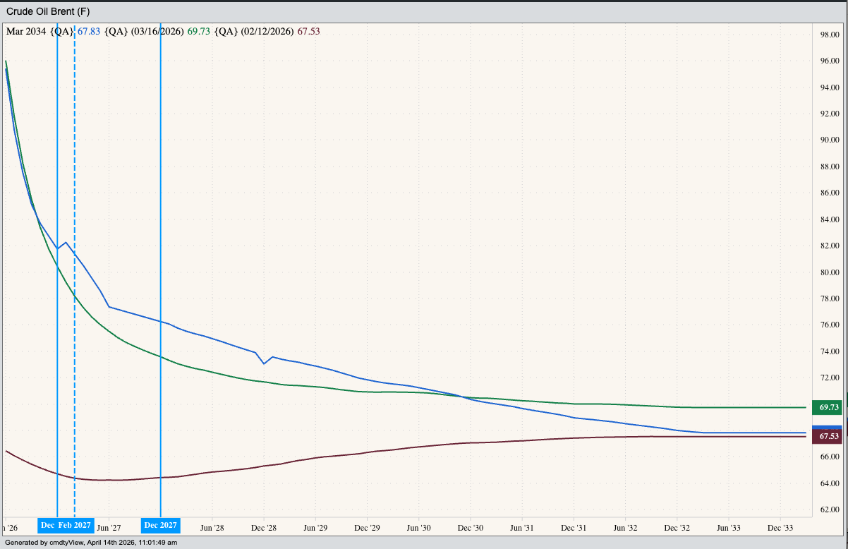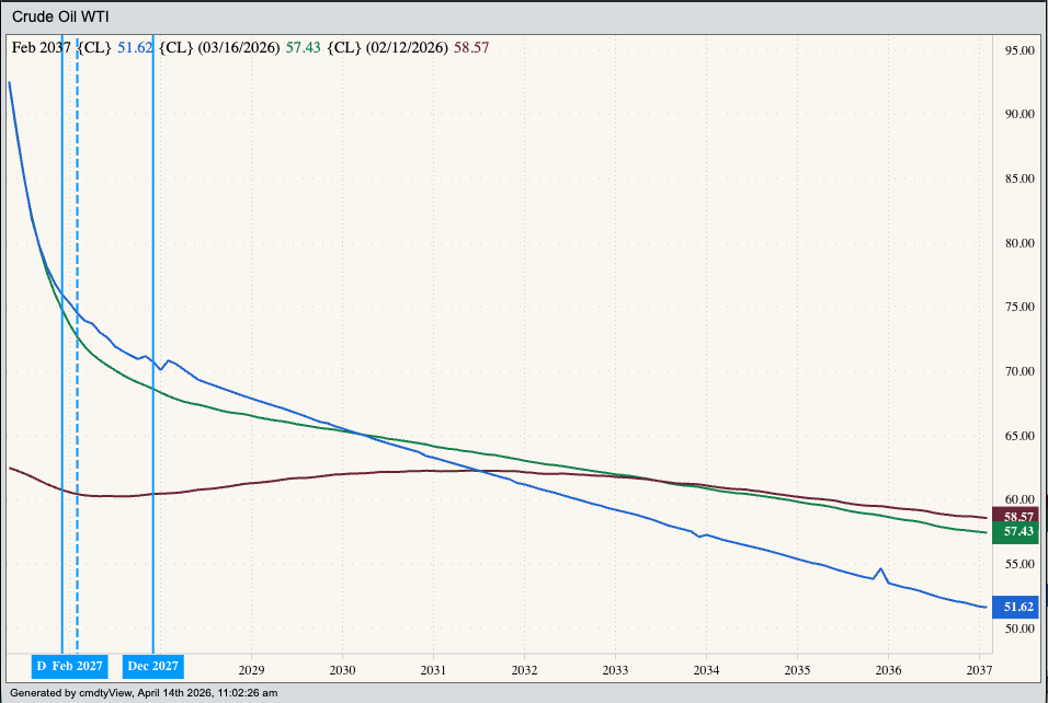 If a rallying market is demand-driven, it’s a bit more difficult. Initially, we tend to see a solid contango as far out we care to look. It’s interesting to note that forward curves for both the global Brent and US domestic WTI crude oil markets show a change from a short-supply scare to long-term demand gaining on available supplies. Back on February 12 the Brent curve was in backwardation from the June 2026 contract through the May 2027 issue, then showing a contango to infinity (and beyond). However, the latest curve shows backwardation starting with June 2026. The WTI curve is a bit more dramatic with the May 2026 issue priced near $92.50 and the May 2036 issue near $52.90.