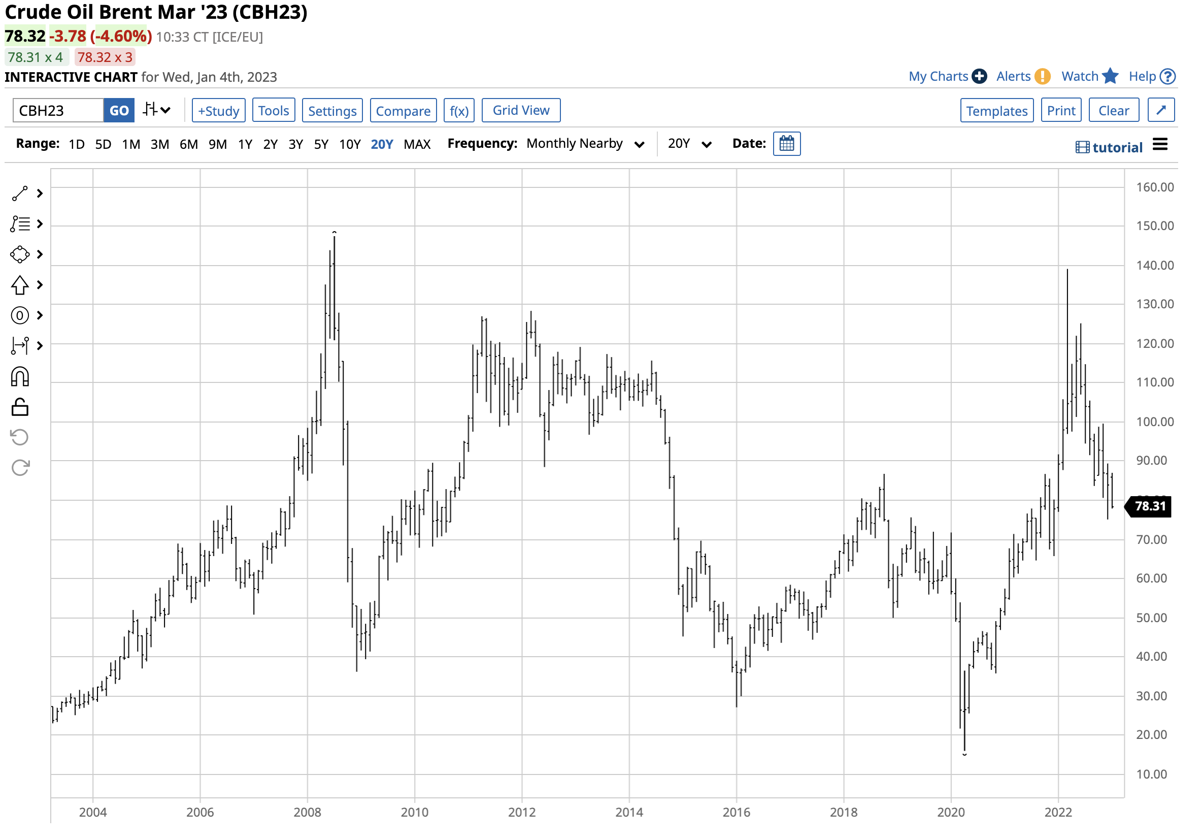 The chart illustrates the price action in Brent crude oil futures. Brent was 0.80% higher in Q4, and while it slightly underperformed WTI in 2022’s final quarter, it outperformed in 2022, rising 10.39% for the year that ended on December 30, 2022. OPEC and Russia pushed Brent higher as it is the crude oil that reflects supplies from Europe, Africa, and the Middle East. Nearby Brent futures closed at $85.82 per barrel on December 30, after falling to $75.11 in December and recovering. Crude oil prices were declining in early January.