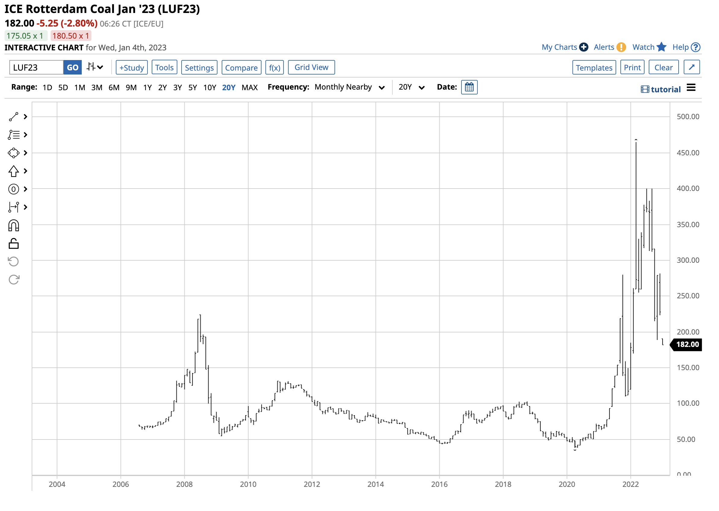 The chart illustrates the rise to the 465 level in March 2022. At $190.50 at the end of 2022, Rotterdam coal was at the highest pre-2021 level since 2008. Coal production has declined over the past years as environmentalists, and zero carbon pledges have weighed on mining activities. However, the increase in oil and gas prices in 2022 pushed coal to record levels as the demand from China, India, and other countries rose, and supplies struggled to keep pace with the requirements.