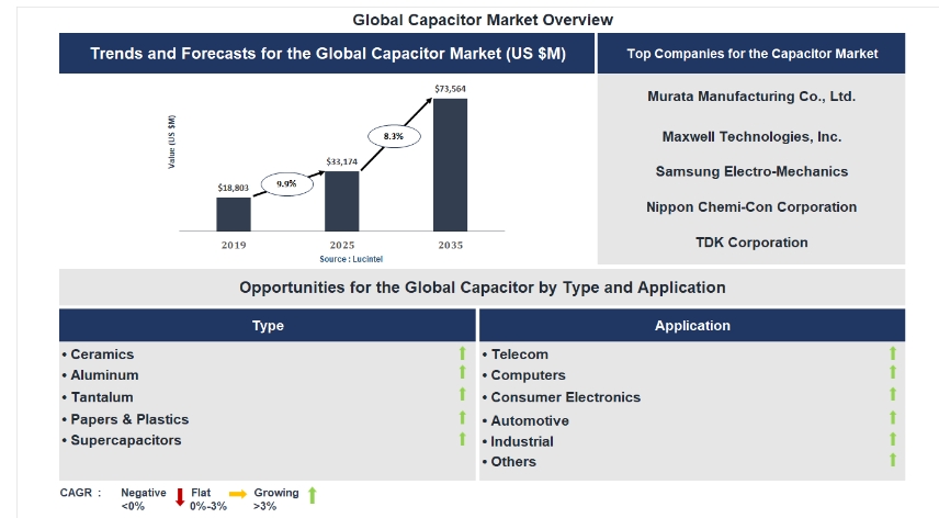 According to a market report by Lucintel, the future of the global capacitor market looks promising with opportunities in the telecom, computer, consumer electronic, automotive, and industrial markets. The global capacitor market is expected to reach an estimated $73564 million by 2035 with a CAGR of 8.3% from 2026 to 2035. The major drivers for this market are the rising adoption of electric vehicles & charging infrastructure, the growing demand for investment in smart grids & power distribution, and the increasing demand for high efficiency electronic device.