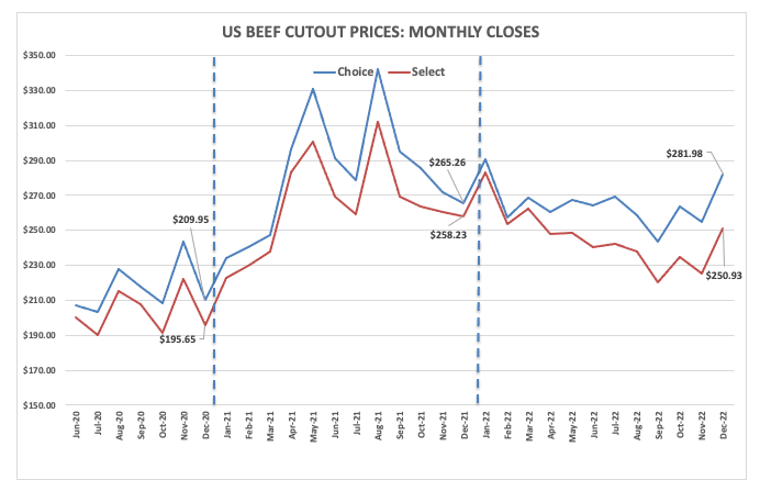 Again, I am not an economist, so I look at things differently. One of the key economic indicators I use is the boxed beef market. At the end of December, the choice market was reportedly priced at $281.98, up $27.10 for the month and $16.72 for the year. Similarly, select was reportedly priced at $250.93, up $25.92 for the month but down $7.30 for the year. My theory is boxed beef shows how willing US consumers are to allocate some of their discretionary income to high priced food items like beef. If the economy is tightening, it is unlikely boxed beef would be jumping higher to close out the year. Some will say the gains are due to increased exports, and the US was projected to export 120 million pounds (mp) more in 2022 than 2021, but domestic demand has also stayed strong given total supplies were estimated to be 459 mp larger this year than last.