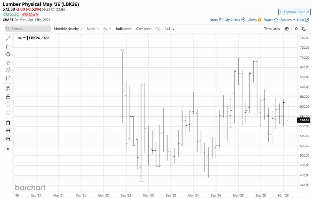 In mid-April, the May physical lumber futures at below $575 per 1,000 board feet level are trading around the middle of the range from December 2025.Â