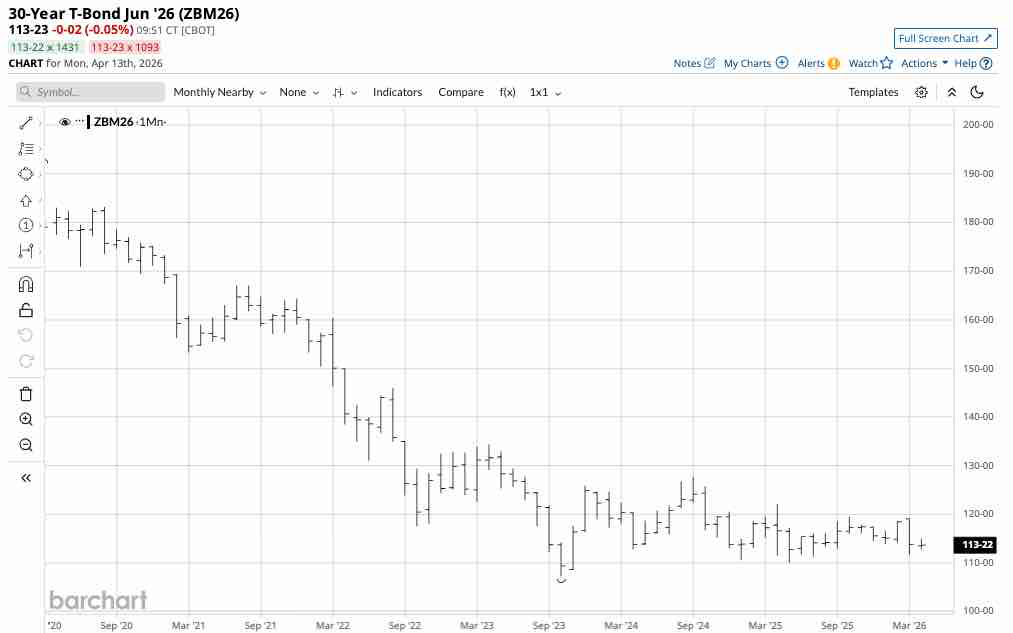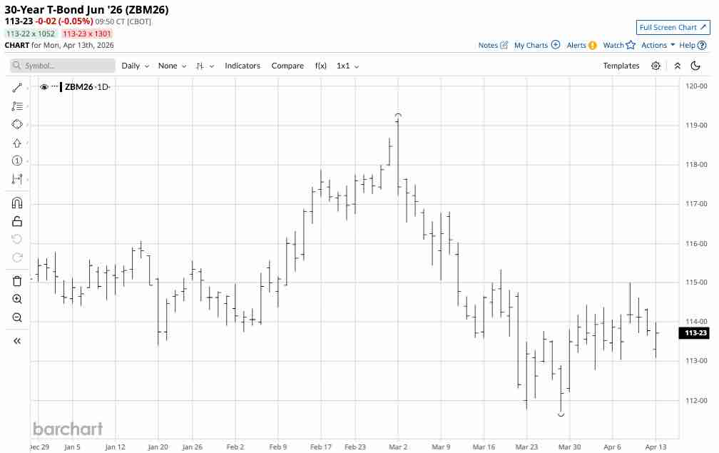 The daily chart of U.S. 30-year Treasury bond futures shows that bond prices fell and interest rates rose after the late February hostilities. Â