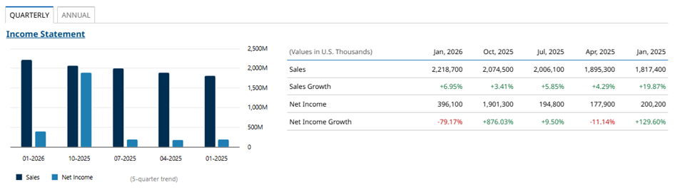 For a long time investors were frightened away by Marvell’s high research and development expenses. However the last data show that the aggressive investment phase began to bear fruit. As is visible from the financial indicators, the revenue of the company is in a stable growth phase. In the quarter that ended January 2026, sales reached $2.21 billion, up almost 7% compared to the previous quarter and by 22% year-over-year (YoY).