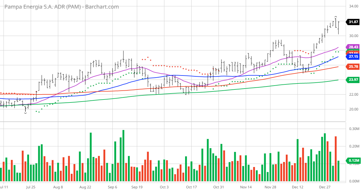 The Chart of the Day belongs to the Argentine energy company Pampa Energia (PAM). Â I found the stock by using Barchart's powerful screening functions to find stocks with the highest technical buy signals, highest Weighted Alpha, superior current momentum and having a Trend Seeker buy signal then used the Flipchart feature to review the charts for consistent price appreciation. Since the Trend Seeker signaled a buy on 11/19 the stock gained 14.76%.