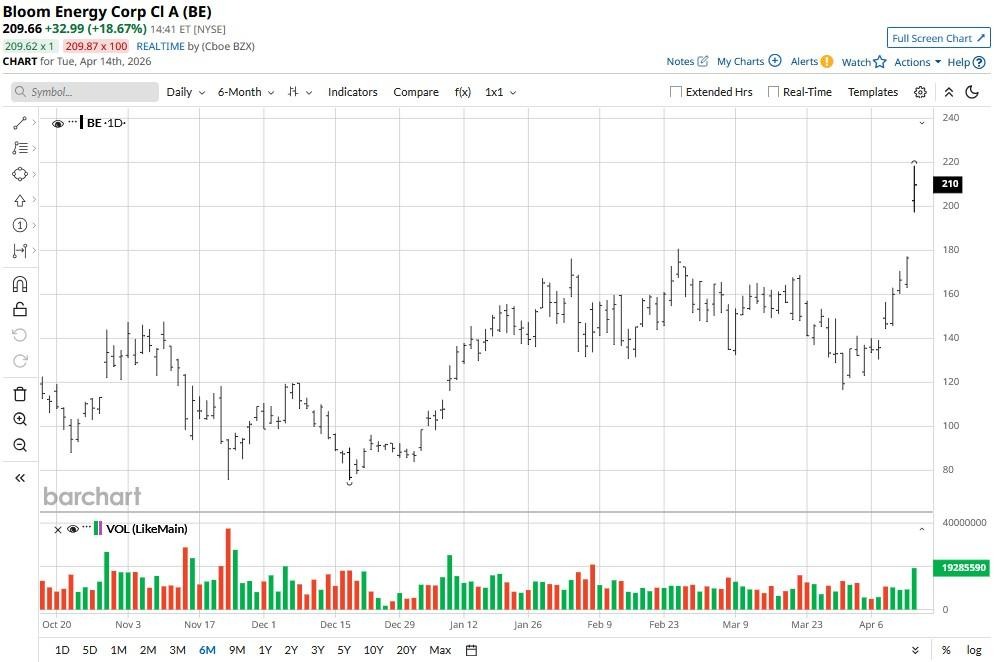 Bloom Energy (BE) shares are rallying on April 14 after the clean energy firm announced a massive expansion of its partnership with Austin-headquartered Oracle (ORCL).